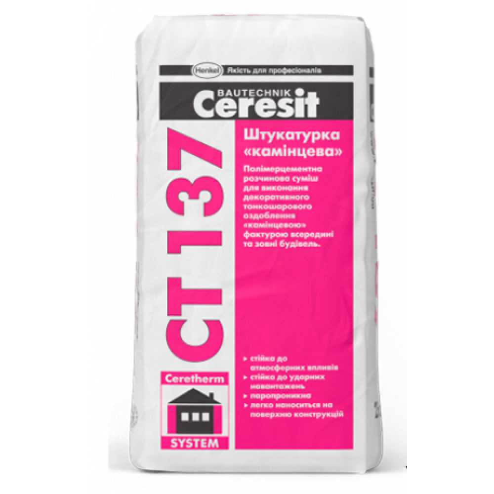 Штукатурка Ceresit CT 137 (пігментована) призначена для декоративного оздоблення всередині і зовні будинків бетонних, цегляних оштукатурених основ, а також при влаштуванні систем теплоізоляції фасадів.