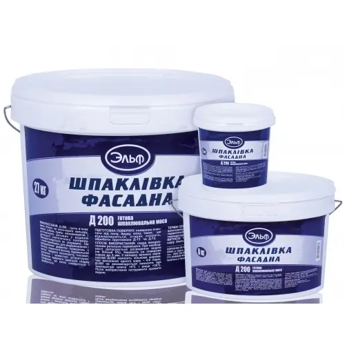 Акрилова фасадна шпаклівка "Ельф" Д-200 Люкс - це готова до застосування густа в'язка маса білого кольору. Представляє суміш суміші наповнювачів і різних допоміжних матеріалів у водній дисперсії синтетичних полімерів. Дозволяє отримати ідеально гладке, високоякісне фінішне біле покриття, яке легко шліфується абразивним папером або сіткою та фарбується.