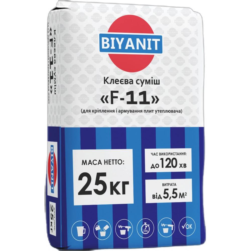 Клейова суміш «F-11»застосовується при зовнішньому і внутрішньому утепленні будівель. Призначена для кріплення пінополістирольних і жорстких мінераловатних плит, для пристрою по ним захисного шару, армованого щелочестойкой скло сіткою, для закріплення плит з екструдованого пінополістиролу с шорсткою поверхнею або с термічно нанесеним рельєфним малюнком. Може служити основою під обробку фінішними декоративними штукатурками, шпаклівками та фасадними фарбами. Клейова суміш ефективна на поверхнях з цегли, бетону, пінобетону; на цементно-вапняній, цементно-піщаній та інших мінеральних основах, як всередині, так і зовні будинку.